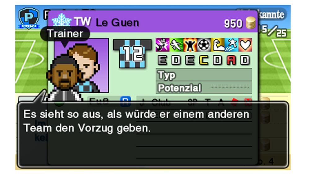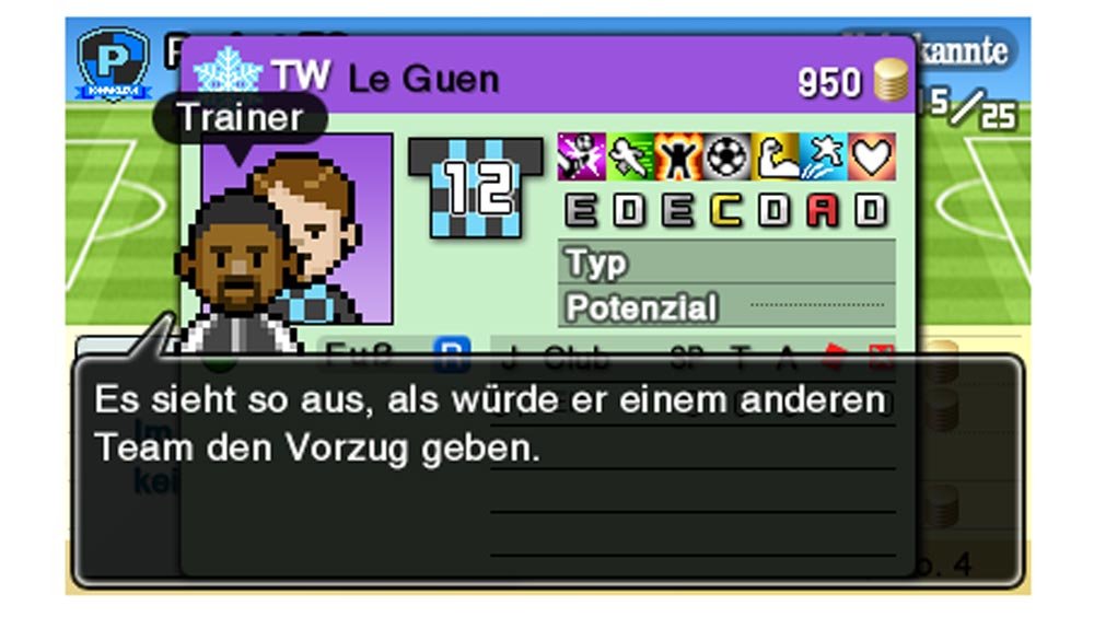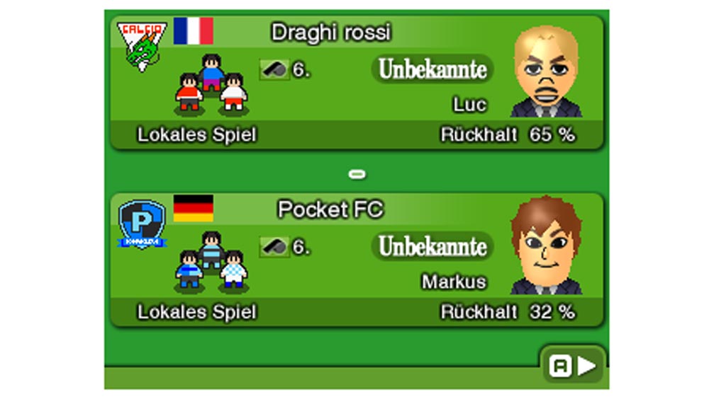 Für mich als absoluten Fußball-Muffel sind derartige Spiele normalerweise Tabu. In Wahrheit kann man die Titel natürlich nicht vergleichen, denn Nintendo Pocket Football Club ist eine Fußball-Management-Simulation. Es geht darum, eine Mannschaft zu verwalten, die Spieler zu trainieren oder zu kaufen und während einem Spiel gebannt auf den Bildschirm zu starren, bzw. den 3DS für zehn Minuten wegzulegen um anschließend auf das Ergebnis zu blicken.