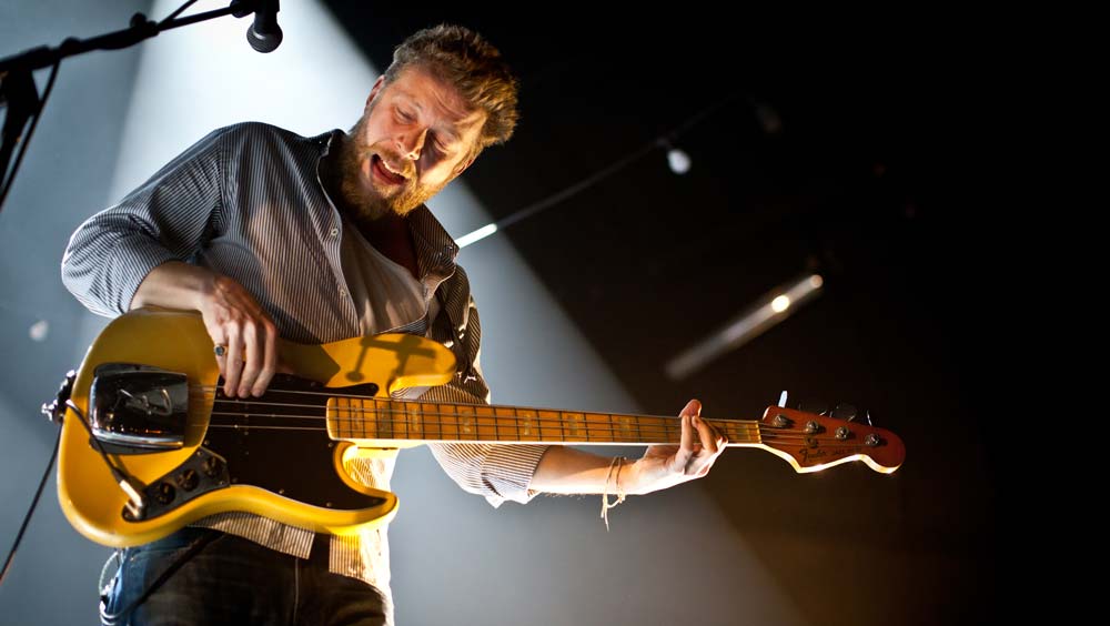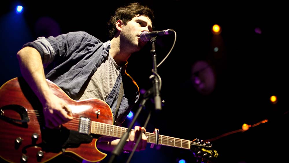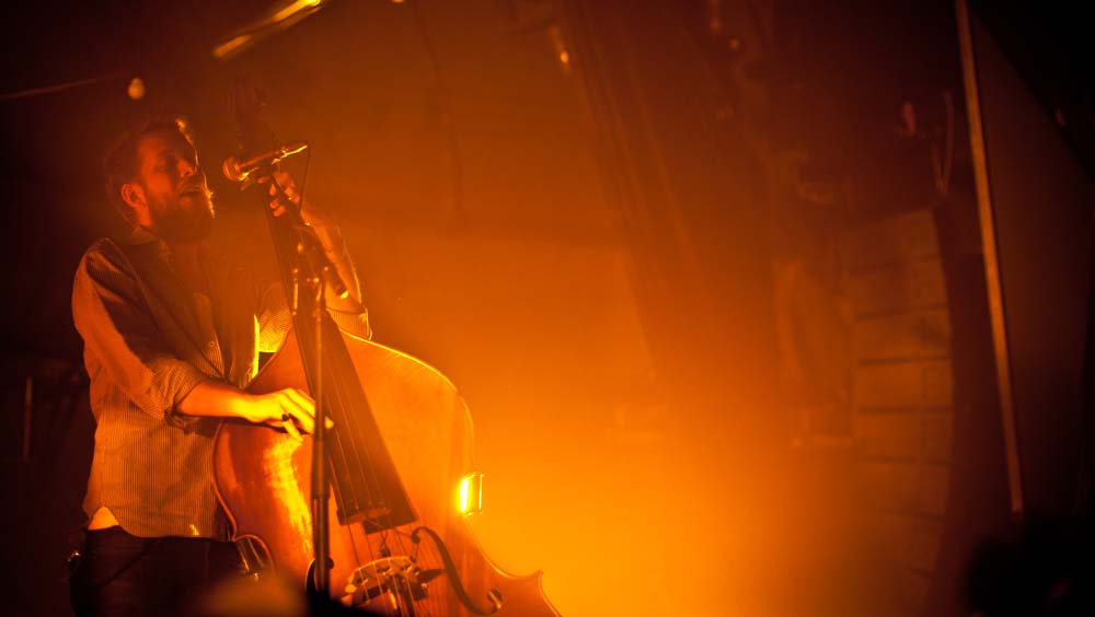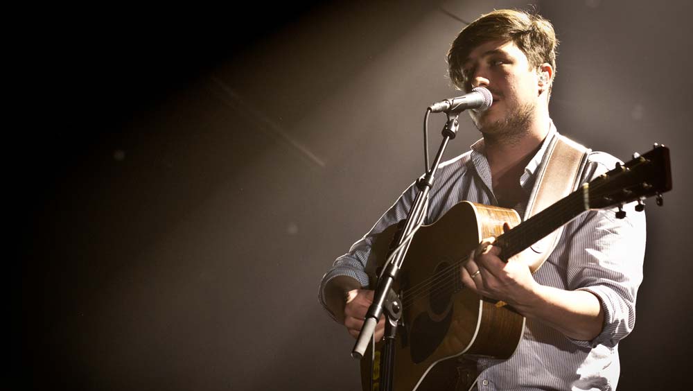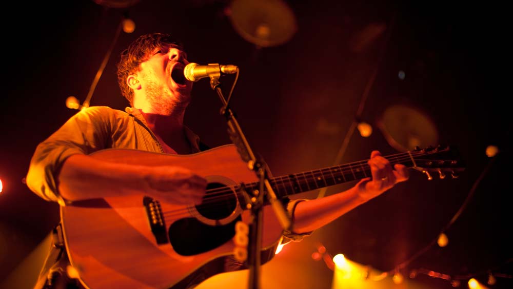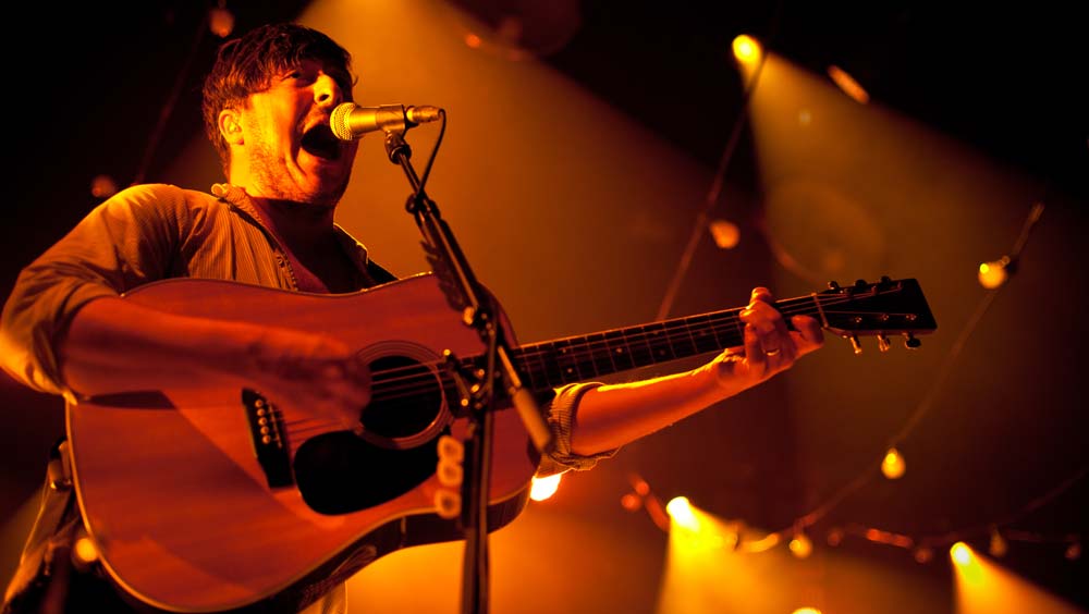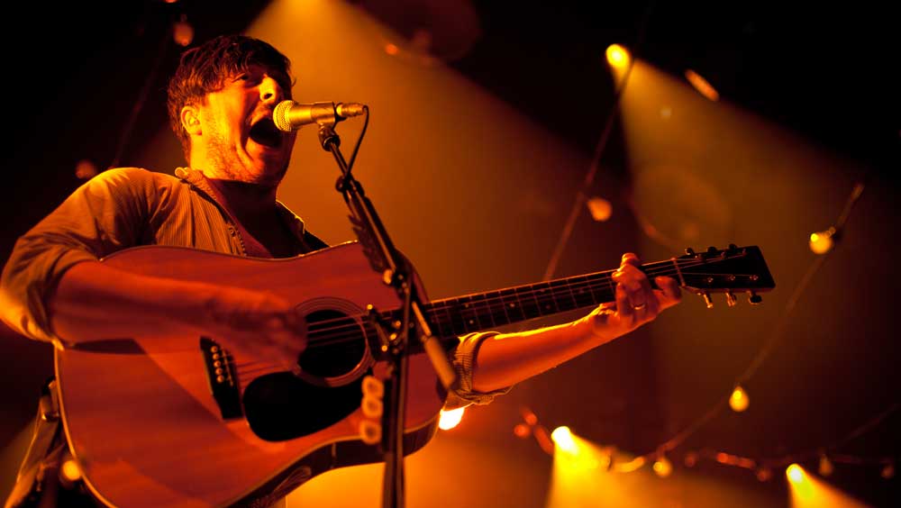 Die Masse wurde langsam unruhig, als sich gegen neun Uhr die Halle bis zum Bersten füllte. Ausverkauft war es, wie gesagt und die Luft zum Schneiden. Lustigerweise war diese sonst so drückende Atmosphäre eine Art unterstützendes Element, als Marcus Mumford mit seinen Jungs auf der Bühne erschien – da brachte eine Gruppe den erdigen, bodenständigen und authentischen Flair mit nach Wien und verwandelte das Gasometer von einem Betonbunker in eine Art uriges, altes Theater, Lampions hingen dazu passend im Hintergrund und alte Glühbirnen, die verfärbt von der Decke baumelten, taten dazu noch das Übrige. Und los ging es mit der Single Babel aus dem aktuellen Album (hier die Kritik): Wie dieses Lied auch schon auf ausgeklügelte Weise das zweite Studioalbum der Band einläutet, wurde damit in Wien ein Musikabend der anderen Art vorweggenommen. Winter Winds wurde kurz danach ins Mikro gesäuselt, dann kam auch schon der Sing-along-Song I will wait, den das Publikum von vorne bis hinten auswendig mitsingen konnte. Aber man wartete ja doch noch – und endlich war er da: Der Moment, in dem Marcus Mumford zur Gitarre griff und den Akkord anschlug, auf den alle warteten: Little Lion Man ging in Wien genauso ab wie in Edinburgh, in New York oder anderswo und das eine – oder andere Auge blieb auch hier nicht trocken.