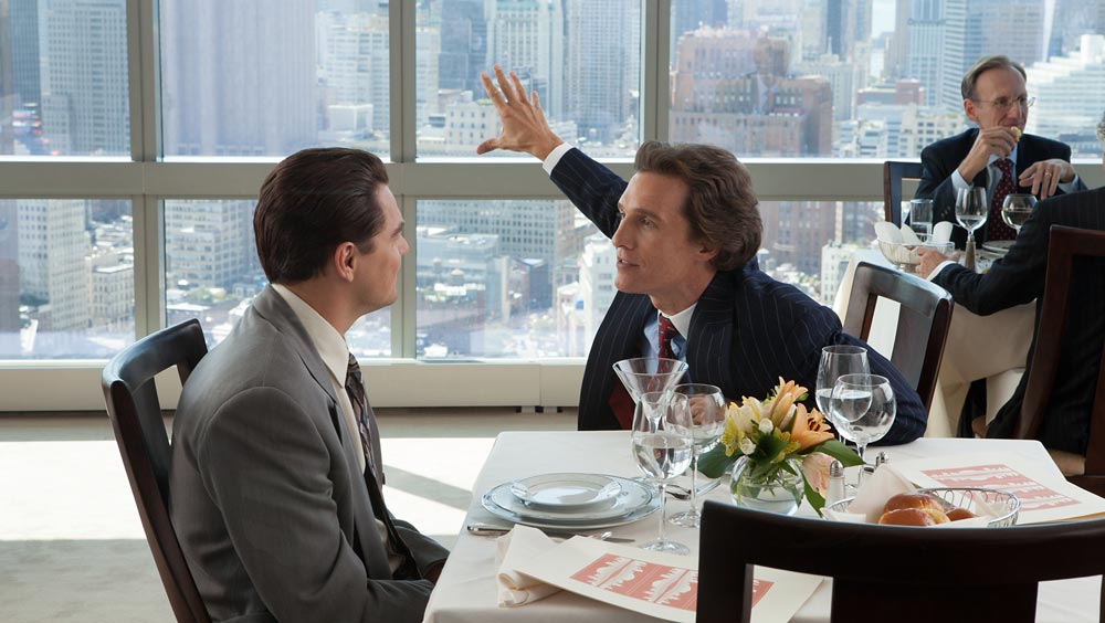 Eine Erfolgsgeschichte ist es nur bedingt und in der Wall Street spielt sie auch nur zu Beginn des Films. Belfort (Leonardo DiCaprio) feiert seinen Einstand in der Firma eines von Matthew McConaughey (kurz, aber intensiv) gespielten Börsenhais, dessen Tage von Martinis und Masturbieren strukturiert werden. Nachdem jedoch seine Broker-Karriere jäh vom „Black Monday“ beendet wird, findet er seinen Weg in eine Firma auf Long Island, deren Führung er nach kurzer Zeit übernimmt. Das Geschäft besteht zum Großteil darin, Kleinanleger mittels Ramschaktien zu prellen. Aus dem Jungspund wird ein Millionär, der sich von seiner lieben, aber allzu durchschnittlichen Freundin trennt, um mit Naomi (Margot Robbie) die heißeste Braut von Bay Ridge zu heiraten. Das hindert ihn allerdings nicht daran, exzessiv der Prostitution zu frönen. Schöne Frauen, wilder Sex, scharfe Drogen und schmutziges Geld in grenzenlosen Höhen gehören zu seiner täglichen Grundausstattung. Seine Firma erinnert über weite Strecken an ein Cabaret, wo seine Mitarbeiter neben allen erdenklichen Amüsements – wie „Zwergewerfen“ – ohne viel Aufhebens mehr als nur ihre Schäfchen beiseite bringen.
